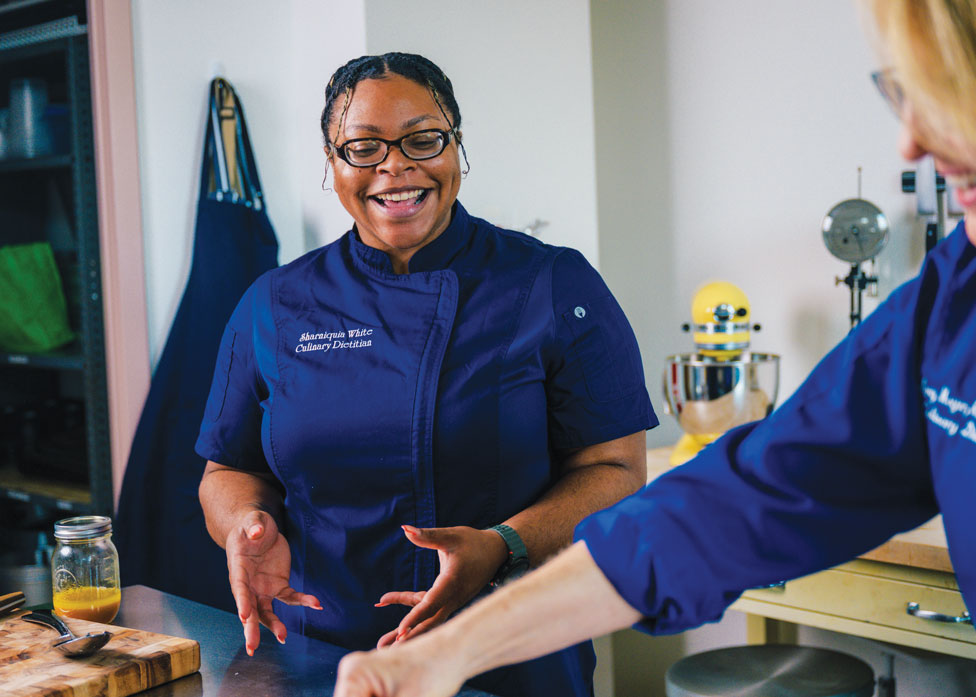 The morning sun shone into the UNCG teaching kitchen in Stone Building. Amy Moyer ’85, ’86 MEd and Sharniquia White ’21, ’23 MS were there to show UNCG Magazine a delicious – and healthy! – fall recipe. Moyer leads the culinary medicine program at UNCG. White, an alumna of the program, is now the resident campus dietitian for Spartan Dining, which includes Fountain View Dining Hall, EUC Food Court, and other eateries on campus.