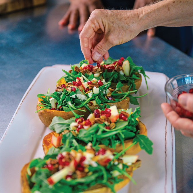 When the butternut squash comes out of the oven, it becomes the “bowl” that the rest of the ingredients – pomegranate seeds, candied pecans, baby kale, arugula, diced apple, dried pumpkin seeds, feta, and a maple balsamic vinaigrette – are served in. Along with nutritious, accessible ingredients, the dish brings bright flavors.