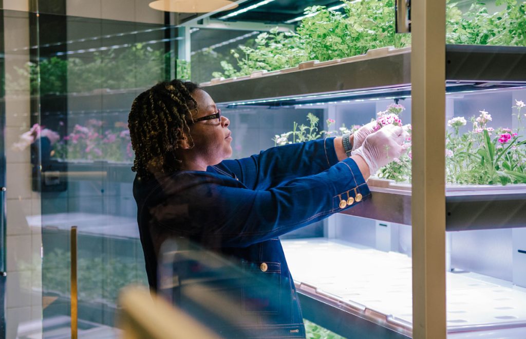 There’s a milk station that includes, along with cow’s milk, chocolate pea milk, oat milk, and soy milk. There’s a hydroponic herb garden growing bok choy that’s used at the Mongolian grill station. It also grows edible flowers and herbs that White uses in mocktails served in the hall.