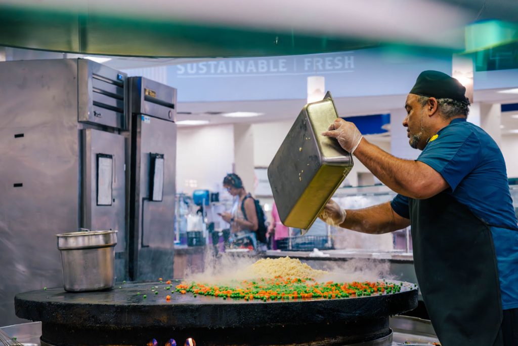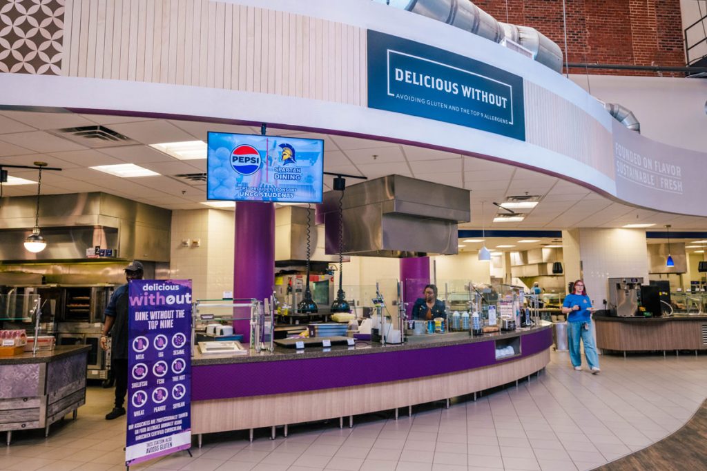There’s a station called “Delicious Without.” It avoids the nine most common food allergens. Diners can spot it easily – everything on the station, from signage to utensils, is purple.