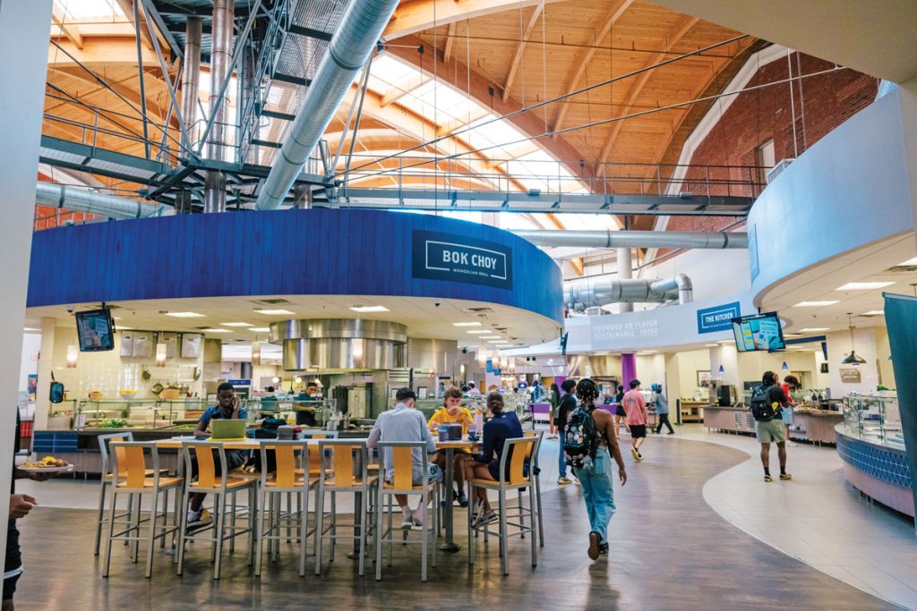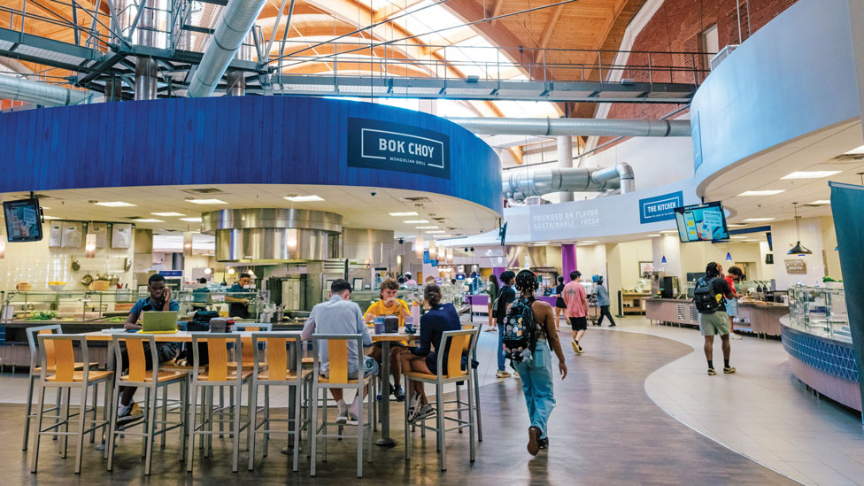 From the stairs to the second-floor dining area, Fountain View opens into a 180-degree view of 13 food stations like The Pit Stop, Homestyle, and The Sweet Shoppe.