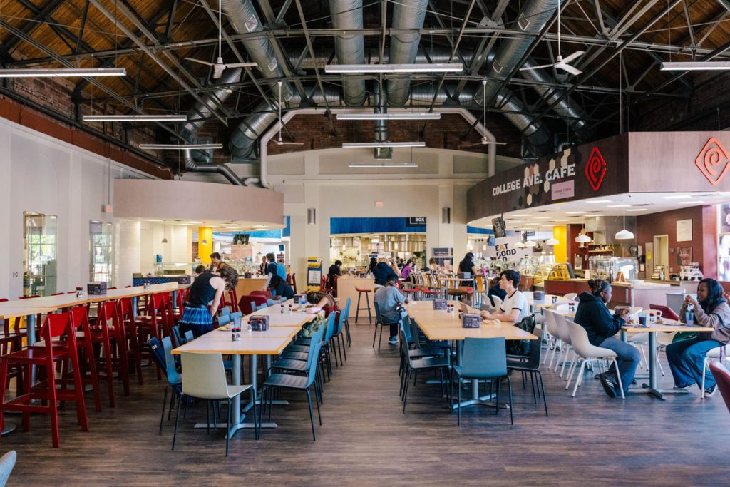Walking into the hall feels like entering a busy train station. The space has high ceilings, exposed beams, and a grand cupola. Mixing soft wood arches, rich brick, and playful finishes, the dining hall is bathed in natural light from large, curved skylights.