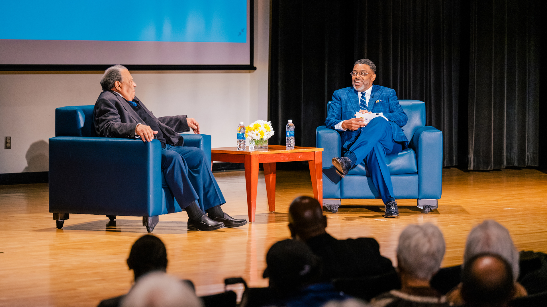 At age 90, Andrew Young stepped on the stage with UNCG Chancellor Franklin D. Gilliam, Jr. for 1 1/2 hours of discussion of his experiences in activism and politics. Young’s first story was about a savage beating during a civil rights march in St. Augustine, Fla., as he tried to get past 300 Klansmen. By the end of the evening’s discussion, he had completed his term as the first Black U.S. Congressman from the Deep South since Reconstruction, been appointed by President Jimmy Carter to become the U.S.’s first Black Ambassador to the United Nations, served as mayor of Atlanta, and worked with the Atlanta business community and Wall Street investors to take the Atlanta airport to a higher level.