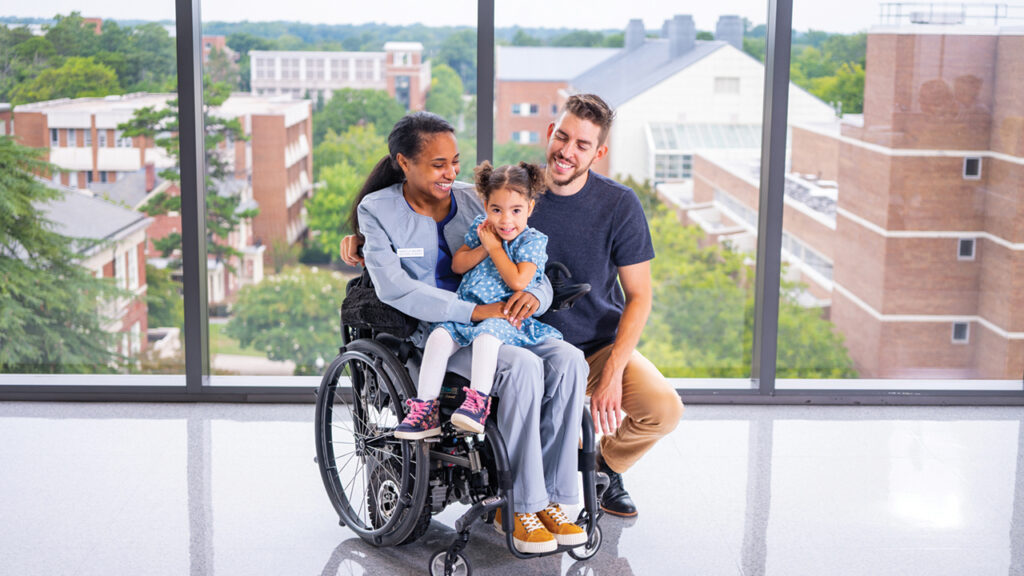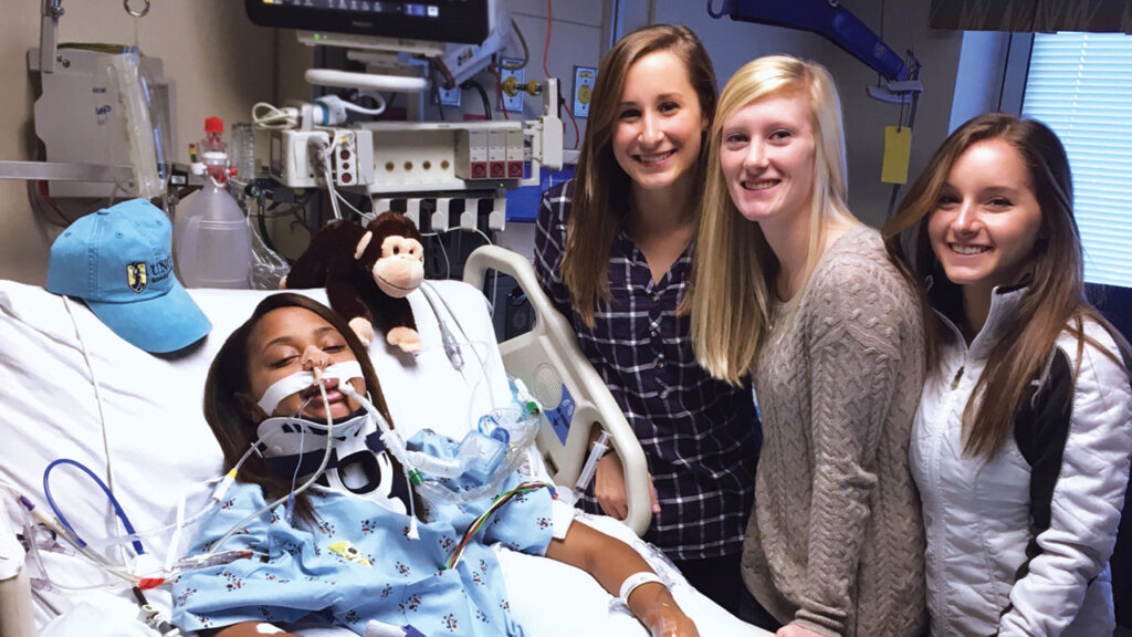 Dr. Lori Hubbard, who taught Baldwin in a childbearing and reproductive health course, visited Baldwin as she was recovering from her spinal cord injury in intensive care. Baldwin had tubes in her nose and throat to help her breathe and eat, and she had a communication board because she couldn’t talk.
